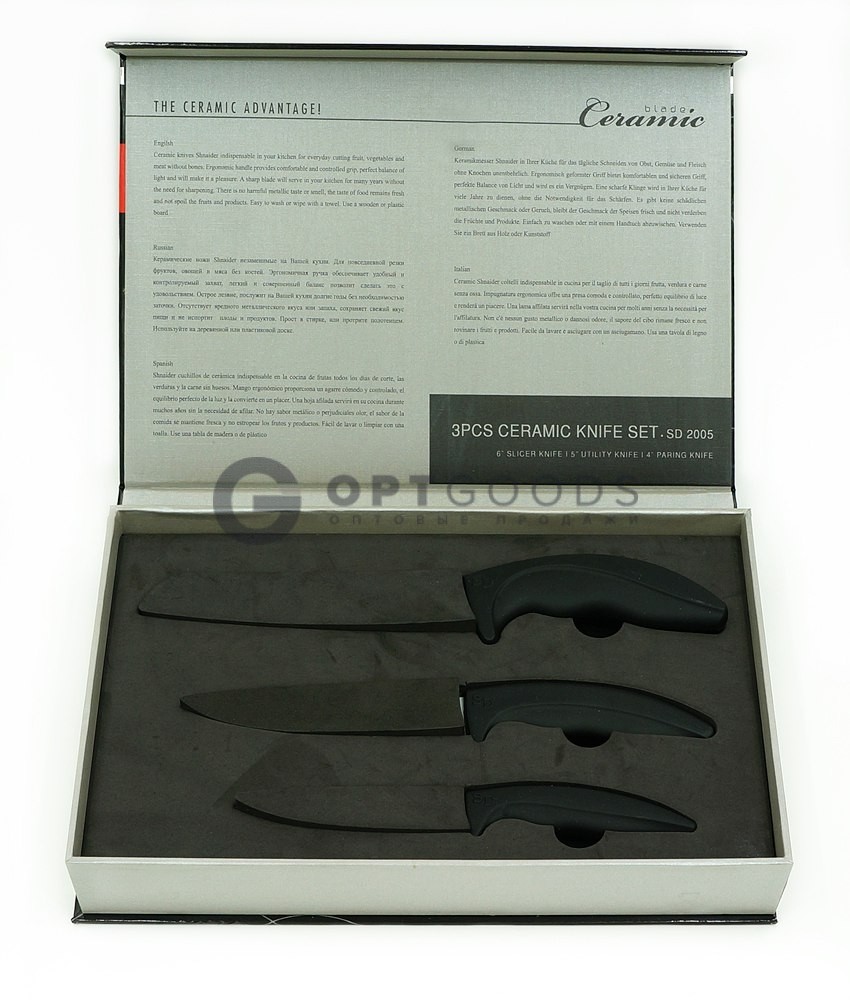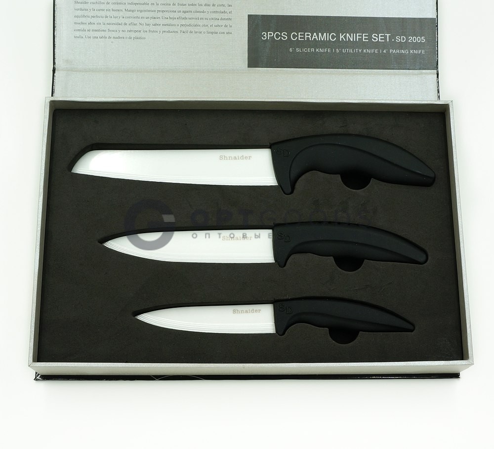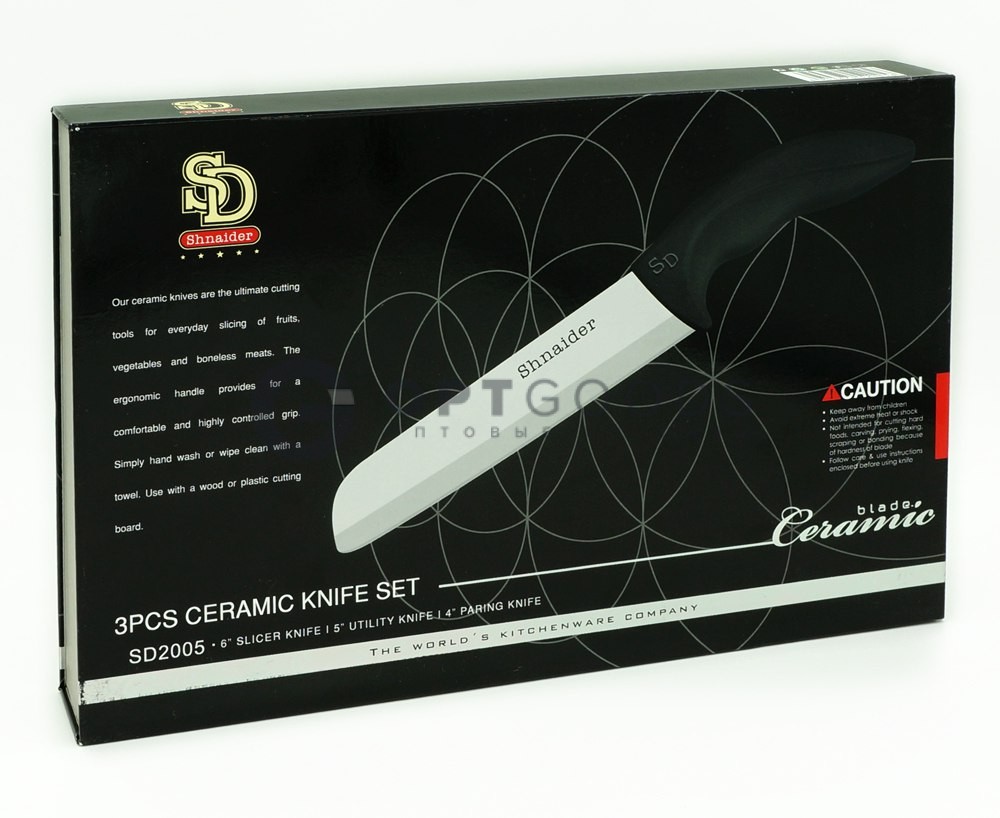 Керамические кухонные ножи Shnaider - выполнены из циркониевой керамики, которая обладает повышенной твердостью, имеют хорошо продуманный дизайн. Набор керамических ножей Shnaider SD2005 включает в себя три предмета – нож для нарезки, универсальный нож и нож для чистки овощей. Лезвия ножей изготовлены из белой керамики. Рукояти из ABS-пластика прорезинены и имеют эргономичную форму. Эти ножи гораздо легче стальных ножей и долго остаются острыми. Керамическими ножами очень удобно, не прилагая особых усилий, нарезать свежие овощи, фрукты, зелень.